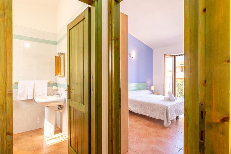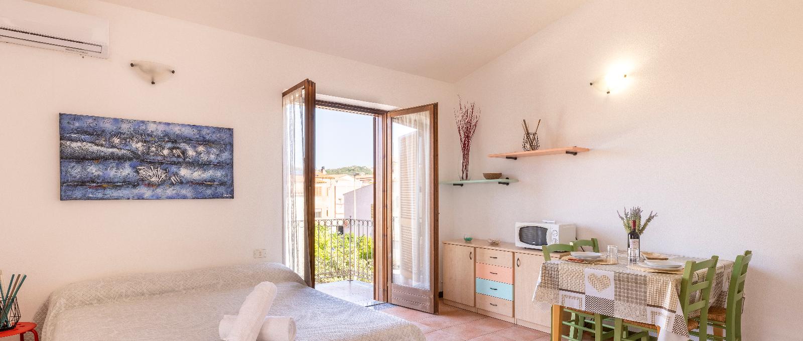 The Studio Apartment for two people (30 m²) features a living room with kitchenette and double bed, bathroom with shower and hairdryer. Some feature a balcony or patio with table and chairs. They are all equipped with air conditioning, Wi-Fi, kitchen utensils, kettle, toaster, microwave, TV, iron and ironing board.